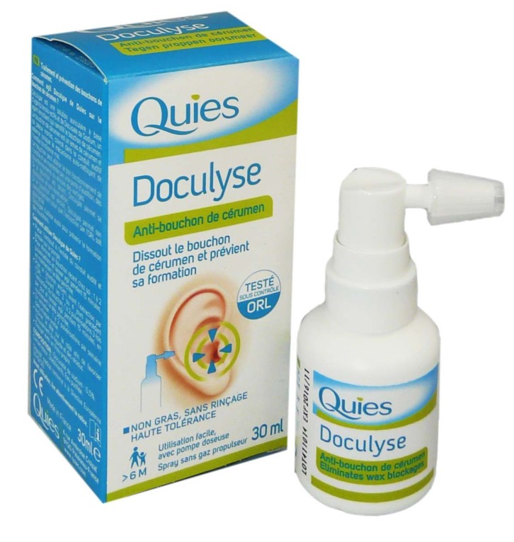 Depuis 1918, le laboratoire Quies (du latin Quiétude) développe de nombreux produits dédiés au bien-être du quotidien : anti-ronflement, protection des oreilles, des yeux ou de la peau. Doculyse Anti Bouchon, est une solution en spray qui va dissoudre l’excès de cérumen dans le conduit auditif, car même si le cérumen protège le conduit auditif des microbes, un excès de ces sécrétions naturelles peut créer un bouchon susceptible de provoquer la diminution de l’audition. Le spray Doculyse anti-bouchon a une double action, il va attaquer la structure des squames constituant la plus grande partie du bouchon et ainsi le désagréger et il va être ramolli grâce à son pouvoir émollient, le bouchon créer va ainsi être évacué. Le spray doculyse est une solution douce pour l’hygiène de vos oreilles, une formule non grasse qui ne se rince pas avec un embout contenant un agent antibactérien qui va assurer la protection et l’hygiène des oreilles. Il peut être utilisé chez l'adulte, les enfants ou les nourrissons de plus de 6 mois.