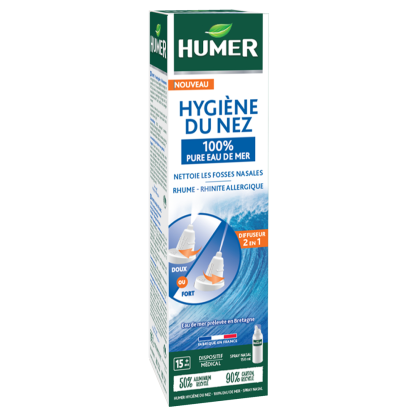 Le spray Humer Hygiène du Nez est conçu pour nettoyer et décongestionne les narines de toute la famille, à partir de 15 ans. Le diffuseur 2 en 1 permet de pulvériser une solution saline pour nettoyer les fosses nasales et pour décongestionner. Ce produit est idéal pour les personnes ayant un rhume, sinusite ou allergies et en prévention. Il est également recommandé pour les personnes ayant une muqueuse nasale sèche ou irritée. La solution saline est composée de 100% d'eau de mer non diluée (provenant de Bretagne), riche en oligo-éléments et en sels minéraux. La formule va humidifier et hydrater les narines et ainsi faciliter le mouchage. Le diffuseur 2 en 1 est facile à utiliser et permet une application douce et efficace. Il dispose de 2 types de jet pour s'adapter à chaque membre de la famille.