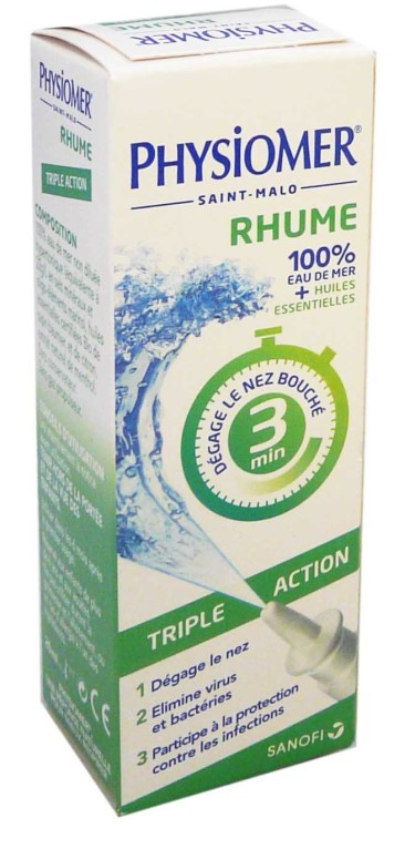 Rhume Triple action de PHYSIOMER spray permet d’éliminer naturellement et tout en douceur les bactéries pour faciliter la respiration et dégager les fosses nasales, et protéger de l’apparition de nouvelles infections, grâce à sa richesse en eau de mer 100% naturelle non diluée hypertonique ainsi qu’aux huiles essentielles certifiées bio (sapin baumier, citron) et d’un extrait naturel de menthol. Rapidement, le nez est débouché pour retrouver une respiration confortable.
