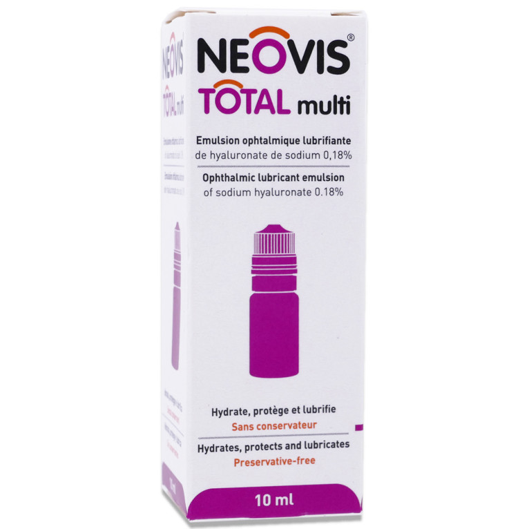 NEOVIS TOTAL MULTI ÉMULSION OPHTALMIQUE LUBRIFIANTE 10ML est en vente en ligne sur le site de votre parapharmacie à prix discount, offrant une émulsion stérile ophtalmique lubrifiante lors de sécheresse oculaire avec kératite ou kérato-conjonctivite sèche