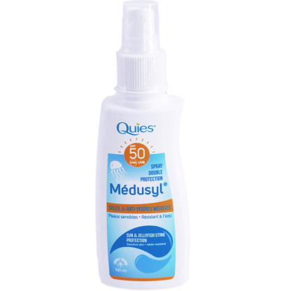 MEDUSYL Spray Double protection SPF50 discount de QUIES, un siècle de protection dans votre parapharmacie en ligne à prix discount, pour protéger la peau du soleil et des brûlures causées par les piqûres de méduse. A partir de 3 ans
