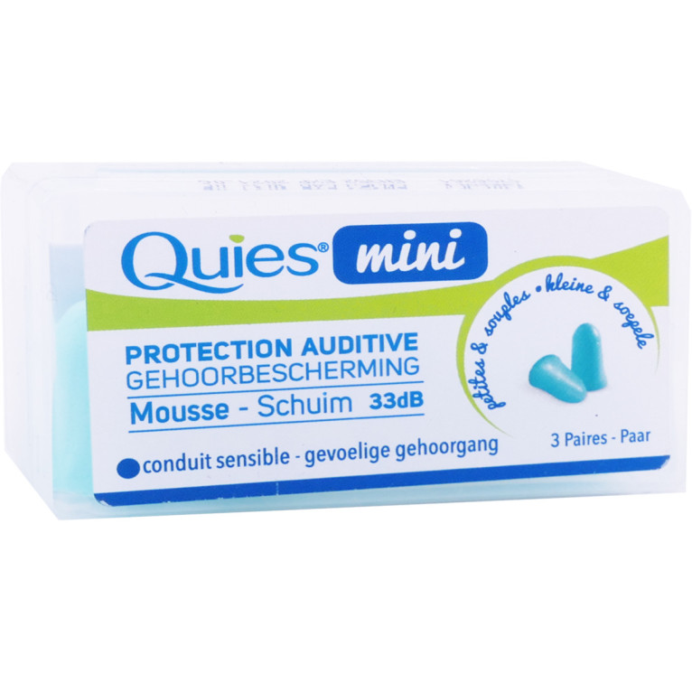 Depuis 1918, la marque Quies (du latin Quiétude) développe de nombreux produits dédiés au bien-être du quotidien : anti-ronflement, protection des oreilles, des yeux ou de la peau. Les protections auditives en mousse QUIES Mini assurent une protection efficace contre la pollution sonore et une atténuation du bruit d’environ 35dB. L’expansion lente de la mousse permet un port ultra-confortable lorsque le conduit auditif est sensible. Leur forme anatomique plus petite, permet une introduction facile dans le conduit auditif et offre un confort optimal sans aucune gêne à l’intérieur de l’oreille.