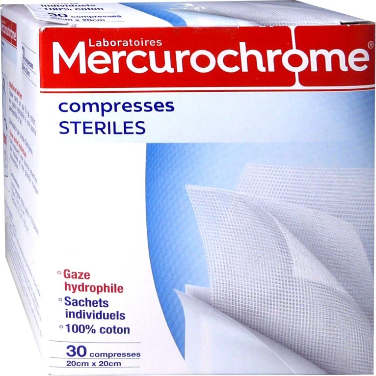 Depuis 1917 Mercurochrome est la marque fidèle aux familles, devenue l’alliée de tous les genoux écorchés avec la création de la fameuse petite bouteille rouge. Aujourd’hui, la vocation de Mercurochrome reste identique : proposer des produits de premiers soins de qualité et accessibles, pour offrir une solution efficace à tous les petits bobos du quotidien. Les compresses stériles de Mercurochrome, en boite de 30 unités en sachet individuel de 5cm x 5cm pliées et 20cm x 20cm dépliées, sont spécialement conçues pour nettoyer, protéger les plaies et limiter la prolifération bactérienne. Ces compresses stériles, aérées, tissées dans un pur fil de coton possèdent une grande vitesse d’absorption et retiennent facilement les liquides. Elles sont idéales pour assurer les premiers soins dans d’excellentes conditions d’hygiène.