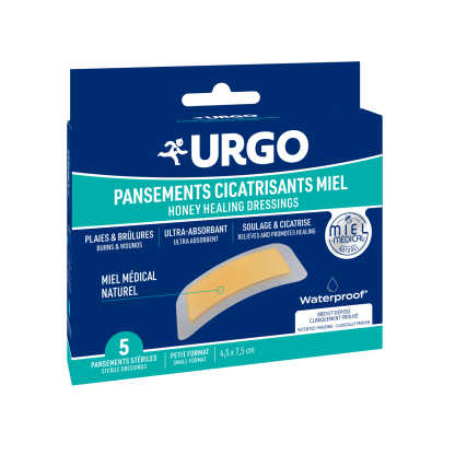 Pansement Cicatrisant Miel médical discount d’URGO, la solution santé à prix discount dans votre parapharmacie en ligne, pour participer à la cicatrisation des plaies superficielles, et petites brûlures (1er et 2nd degré).