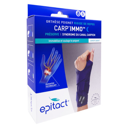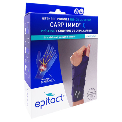 Orthèse Poignet Rigide Carp’Immo d’EPITACT dans votre parapharmacie en ligne à prix discount, soulage les douleurs articulaires de la base du pouce (canal carpien) de la main droite pendant la phase de repos (nuit, main au repos). Taille au choix : S, M, L