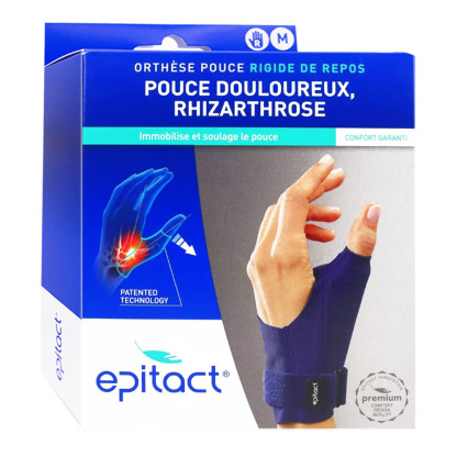 Le laboratoire EPITACT a conçu des produits pour apporter soin et confort aux problèmes de pieds. L’orthèse Pouce Rigide de Repos corrige et soulage en immobilisant et luttant contre la rhizarthrose qui fait souffrir. Elle permet de faire un écart entre le pouce et l’index pour que le pouce soit au repos et ainsi évite tout traumatisme grâce à son tissu et son tendon thermoformable qui maintient l’alignement de l’articulation et réduit la douleur. En l’utilisant pendant la nuit ou lorsque la main est au repos, le pouce sera progressivement ré-axé. Semi-rigide et réglable pour s’adapter à la morphologie de la main, discrète et ultrafine, l’orthèse se fera oublier. L’orthèse se lave en machine à 30°C pour une bonne protection longue durée
