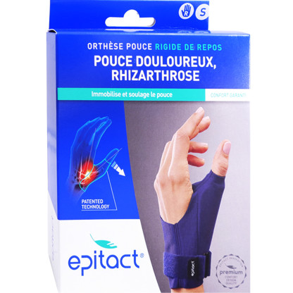 Orthèse Pouce Rigide de Repos d’EPITACT dans votre parapharmacie en ligne à prix discount, soulage les douleurs articulaires de la base du pouce (rhizarthrose) de la main droite pendant la phase de repos (nuit, main au repos). Taille S