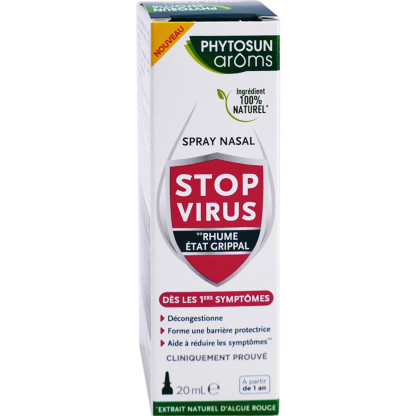 Phytosun arôms Spray Nasal Stop Virus est un dispositif médical sous forme de spray nasal particulièrement recommandé pour les personnes atteintes d’infections virales des voies respiratoires supérieures. Ce spray à base d’extrait naturel d’algue rouge offre 2 actions : décongestionnante et protectrice. En décongestionnant les fosses nasales, le nez bouché sera dégagé lors de rhume ou d’état grippal causé par les virus. En protégeant le nez, le Spray Nasal Stop Virus luttera contre la réapparition des symptômes du rhume et à une nouvelle infection, tout en réduisant la gravité des symptômes afin de raccourcir leur durée. Sans effet de somnolence, sans risque de surdosage, sans conservateurs.