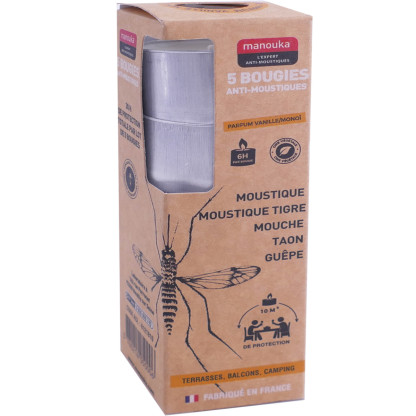 MANOUKA est une marque spécialisée dans le développement de produits anti-moustique innovants, colorés et ludiques, adaptés à tous les besoins : du bébé à la peau fine et délicate jusqu’au globe-trotter le plus téméraire. La Bougie Anti-moustiques de MANOUKA, est un produit révolutionnaire à base de géranil et cire végétale qu’il suffit d’allumer pour assurer une protection anti-moustique (dont moustique tigre) et autres insectes (mouches, guêpe) immédiate et très efficace jusqu’à 6 heures. La Bougie Anti-moustiques permet une protection des piqûres d’insecte dans un rayon de 10 mètres autour. Allumée, elle délivre un doux parfum de vanille et monoï. Fabriquée en France.