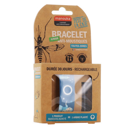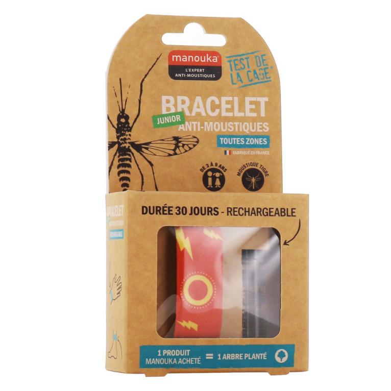 Le Bracelet Anti-moustiques Junior de MANOUKA, qui se place facilement au poignet ou à la cheville, est un produit révolutionnaire à base d’IR3535 (10%) et de citriodiol (5%) sans DEET. Il assure une protection anti-moustique (y compris moustique tigre) très efficace, jusqu’à 6 heures et une action répulsive sur un rayon de 1 m. Pour une protection antimoustique chez les enfants de moins de 3 ans, il est conseillé d’accrocher le bracelet à la poussette, une chaise,… Efficacité prouvée cliniquement par le test de la cage.