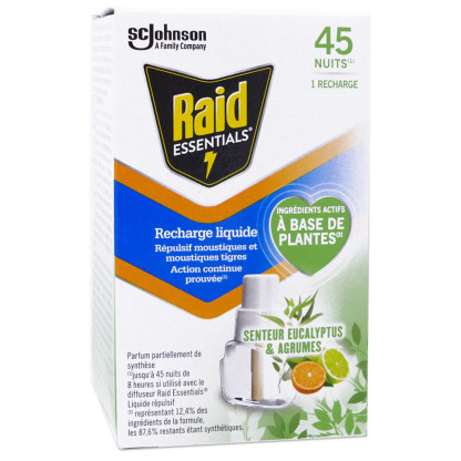 Raid, une marque reconnue pour son expertise en solutions anti-insectes, propose cette recharge pour diffuseur électrique RAID ESSENTIALS, formulé avec des ingrédients d'origine végétale.