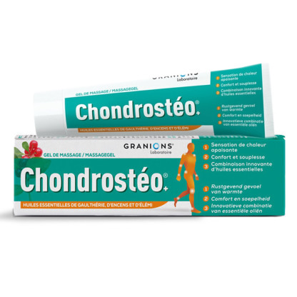 Le groupe français EA et les laboratoires des GRANIONS développent des compléments alimentaires et des produits élaborés avec des actifs d'origine naturelle de grande qualité : plantes, oligoéléments, acides gras, vitamines et minéraux, afin d’offrir une solution santé et bien-être à tous les maux du quotidien. GRANIONS CHONDROSTEO gel est un soin spécialement formulé pour rétablir le confort articulaire en association avec les bienfaits d’une application par massage. Sa formule unique est composée de glucosamine qui contribue à maintenir une bonne fonction articulaire, de silicium organique, d’harpagophytum et de chondroïtine d’origine marine qui favorisent la souplesse et le confort articulaire, de cuivre qui maintient l’intégrité des tissus conjonctifs dont le cartilage, du collagène et des huiles essentielles de gaulthérie, d’encens et d’élémi qui ont la propriété de diffuser une chaleur douce au contact avec la peau et offrent un soulagement immédiat. Sans paraben.
