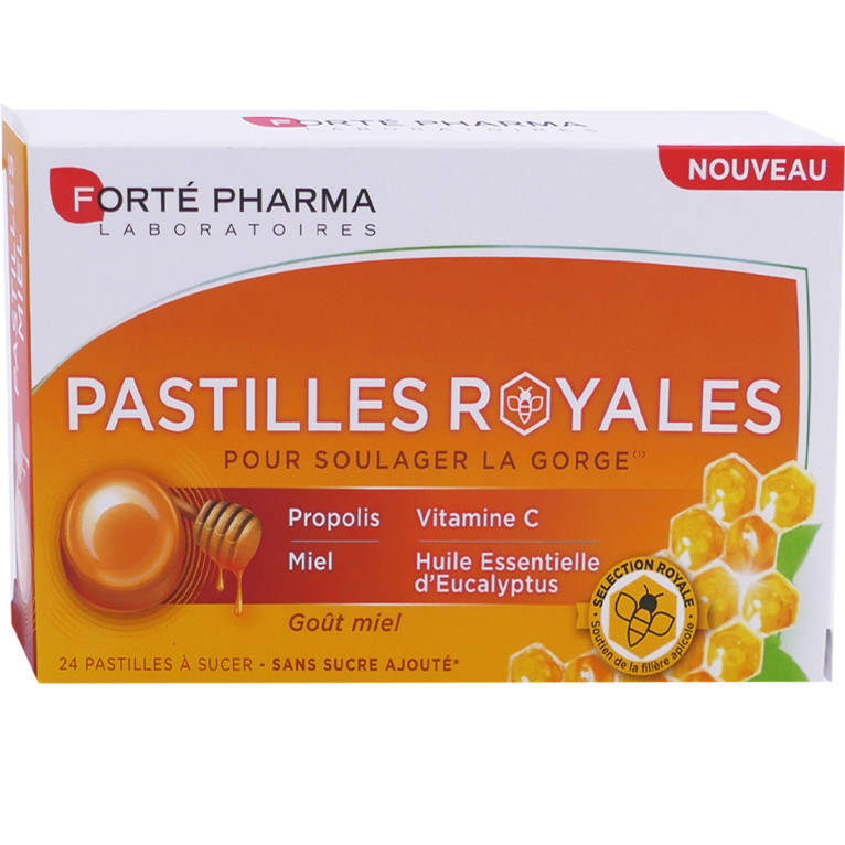 Depuis 1999, les Laboratoires FORTÉ PHARMA développent des compléments alimentaires efficaces et innovants, aux formules issues de la recherche en nutrition cellulaire, pour contribuer aux ressources des utilisateurs. L’univers Santé de FORTÉ PHARMA propose des produits conçus pour préserver le capital santé et se sentir bien au quotidien. Les pastilles Royales de FORTE PHARMA sont composées de miel, propolis, huile essentielle d’eucalyptus, et vitamine C. L'eucalyptus apaise les cordes vocales, et participe au confort respiratoire. Au goût naturel de miel, ces pastilles seront agréables à consommer. Avec édulcorants. Sans sucres ajoutés