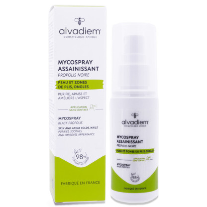 Proposé par la marque Alvadiem, ce spray offre une texture légère et facile à appliquer, idéale pour une utilisation rapide et efficace. Il se distingue par sa composition enrichie en propolis noire, connue pour ses propriétés protectrices, en terpinéol, reconnu pour ses vertus purifiantes, et en extrait de roseau, qui contribue à apaiser la peau. Ces ingrédients actifs sont soigneusement sélectionnés pour garantir un soin cosmétique de qualité, respectant la réglementation européenne en vigueur.