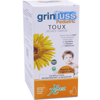 Grintuss Pediatric ABOCA est un dispositif médical sous forme de sirop à base d’un complexe moléculaire (grindelia, plantain, hélichryse), et de miel. Il permet de calmer la toux en protégeant la muqueuse. Il contribue à lutter contre l'irritation de la muqueuse responsable de la toux sèche et favorise l'élimination du mucus ainsi que l'hydratation des muqueuses. En formant un film protecteur pour limiter l’adhésion des agents extérieurs, il soulage les irritations de la gorge, favorise l’expectoration en fluidifiant les sécrétions de mucus par la stimulation de l’hydratation, et en cela atténuer les toux sèches ou grasses. Le Miel présent dans la formulation donne un agréable goût au sirop. Sans substances de synthèse, 100 % naturel, GrinTuss Pediatric contient également des huiles essentielles de citron, orange douce et myrte ainsi que de l'arôme naturel de citron. Sans gluten.