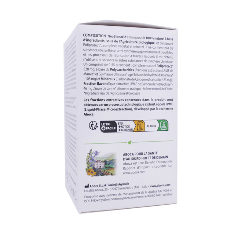 Ce produit, élaboré par le laboratoire Aboca, est formulé du complexe Poliprotect, un complexe végétal et minéral 100% naturel et bio à base de plantes naturelles telles que la réglisse, la camomille et le carbonate de calcium. Ce dispositif médical en comprimés agit rapidement en créant un film protecteur qui neutralise localement l'acidité, participe à la protection de la muqueuse gastrique et favorise sa réparation. Il module l'acidité sans la supprimer, respectant ainsi la physiologie de l'estomac et la flore intestinale. Les comprimés Neo Bianacid sont faciles à prendre et conviennent à toute la famille (dès 6 ans).