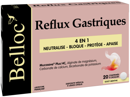 BELLOC REFLUX GASTRIQUES 4 EN 1 20 COMPRIMES GOÛT MENTHE est un dispositif médical innovant en vente en ligne, sur le site de votre parapharmacie à prix discount. Ce produit est conçu pour apporter un soulagement efficace des symptômes liés au reflux gastro-œsophagien.