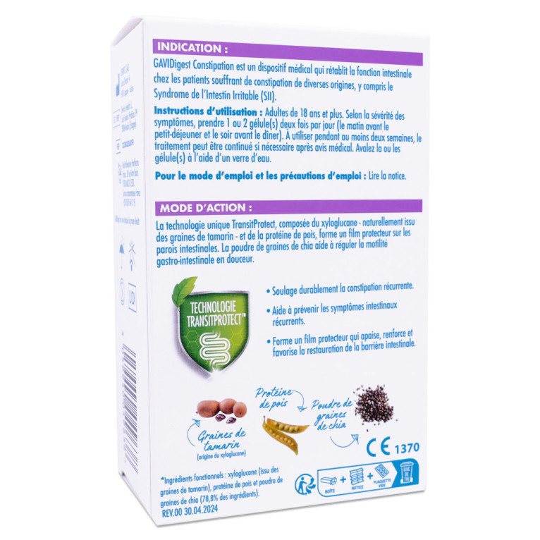 Découvrez les gélules GAVIDIGEST CONSTIPATION, un dispositif médical innovant à prendre lors de constipation y compris le syndrome de l'intestin irritable. Grâce à sa technologie TransiProtect, ce produit contient des ingrédients naturels tels les graines de tamarin (origine du xyloglucane), connues pour leur action bénéfique sur le transit intestinal en formant un film protecteur pour restaurer la barrière intestinale, la protéine de pois qui aide à réduire les ballonnements et les flatulences et, ainsi que la poudre de graines de chia, reconnue pour réguler la motilité gastro-intestinale en douceur. Ces gélules sont spécialement conçues pour soulager la constipation de manière efficace et en douceur.