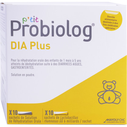 P’tit Probiolog DIA PLUS des laboratoires MAYOLY est une denrée alimentaire destinée à des fins médicales spéciales en sachets, spécialement conçu pour contribuer à la réhydratation orale des jeunes enfants atteints de déshydration dans les épisodes de diarrhées, et gastroentérites. Consulter votre médecin.