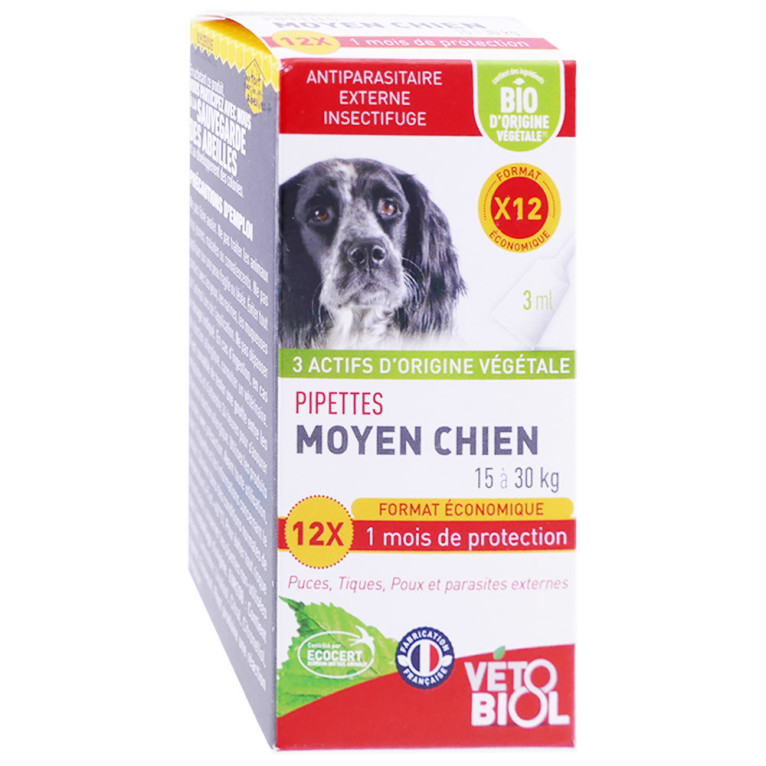 VETOBIOL BIO ANTIPARASITAIRE PIPETTES MOYEN CHIEN 12X3ML