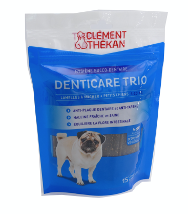 DENTICARE TRIO discount de CLEMENT THEKAN, la friandise en lamelles à mâcher pour agir sur la sphère bucco-dentaire chez les chiens, dans votre parapharmacie en ligne à prix discount. Petit chien de 5kg à 10kg