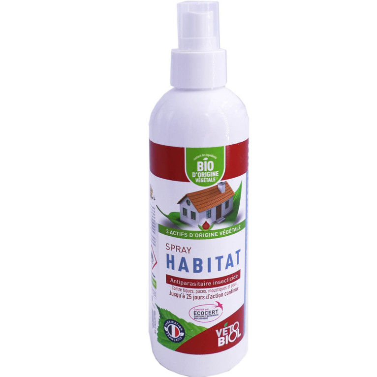 Spray Habitat discount VETOBIOL, la solution idéale dans votre parapharmacie à prix discount qui traite l’environnement des animaux de compagnie en complément des traitements vétérinaires, pour débarrasser des puces, tiques, acariens, poux, moustiques,… pendant 25 jours.