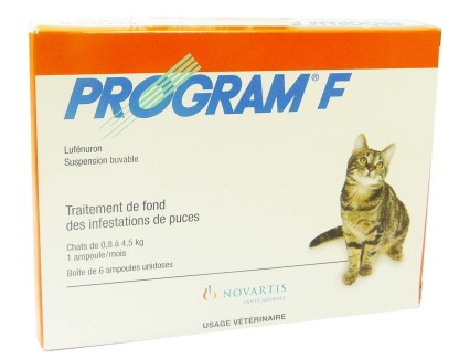 PROGRAM F de NOVARTIS, le traitement de fond pour lutter contre les puces chez les chats de 800 g à 4,5 kg indiqué également chez les femelles en période de lactation et de gestation.