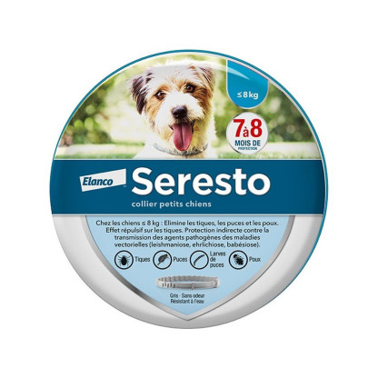Le collier Insectifuge pour petit chien (– 8 kg) de SERESTO, pour une action efficace et longue durée de 8 mois sur les parasites du chiens (puces et tiques).