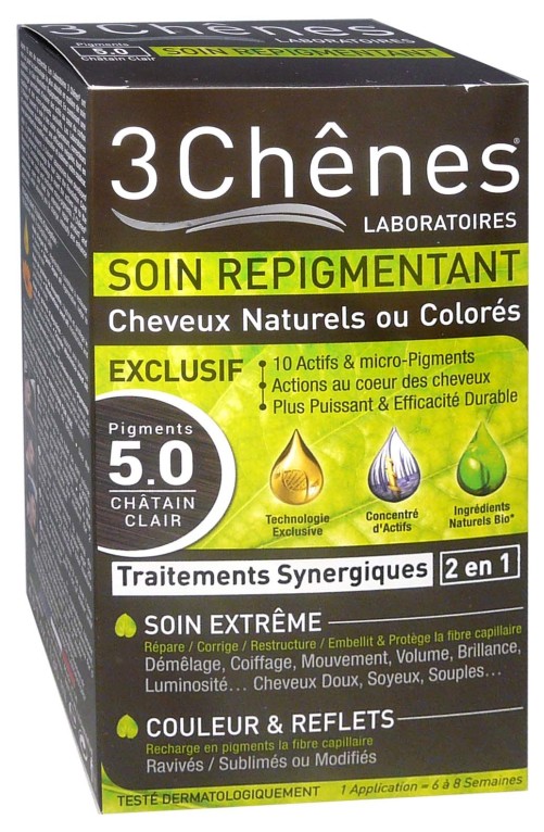 Soin repigmentant des 3 CHENES, une couleur sublime intense et de longue durée pour des cheveux réparés pleins de vitalité et lumineux aux reflets intenses. Pour cheveux naturels, colorés ou méchés. Couleur 5.0 châtain clair.