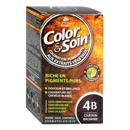 Color & Soins Coloration Permanente discount des laboratoires 3 Chênes, efficacité, naturalité et innovation dans votre parapharmacie en ligne à prix discount, dans une coloration aux extraits végétaux qui offre soin et reflets intenses aux cheveux, protection et douceur aux cuirs chevelus les plus sensibles. 4B Châtain Brownie