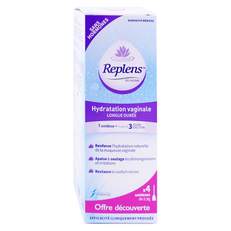 REPLENS Gel vaginal à base de polycarbophile et d’eau purifiée, hydrate intensément l’entrée du vagin en assurant une muco-adhésion à la surface des cellules épithéliales et lubrifie la muqueuse vaginale en se diffusant à long terme (3 jours). Il va lutter contre la sècheresse qui peut être causée par la grossesse, la ménopause ou pré ménopause, les traitements, calmer les irritations et autres inconforts, et faciliter la pénétration lors de rapports sexuels en lubrifiant et en assouplissant la partie externe des zones génitales, tout en respectant l’équilibre de la flore vaginale. REPLENS Gel vaginal ne coule pas. Dès l’application, les irritations, tiraillements sont apaisés pour retrouver douceur, fraîcheur et confort et dure pendant 3 jours. Peut être associé à une hormonothérapie de substitution et compatible avec les préservatifs. Sans hormones, sans paraben, sans parfum, sans colorant. Efficacité cliniquement prouvée