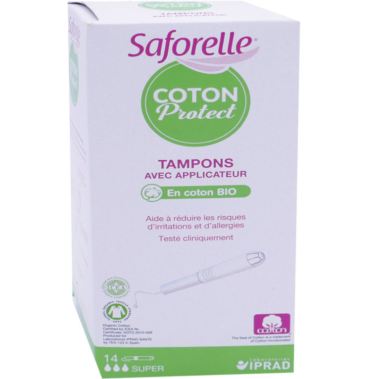 Afin de répondre aux besoins spécifiques de la sphère intime féminine, SAFORELLE a développé une gamme de protections périodiques conçus avec du coton biologique, destinés à prendre soin de la flore vaginale : COTON PROTECT. Les Tampons Coton Protect sont particulièrement adapté aux flux normaux. Grâce au voile protecteur en coton biologique avec son cœur absorbant et l’applicateur au bout arrondi, ils s’insèrent facilement et limite les irritations grâce à sa composition en coton biologique. Le cordon permet d’être retiré facilement et sans douleur. Hypoallergéniques, les tampons prennent soin de la flore intime et limite les irritations et allergies.