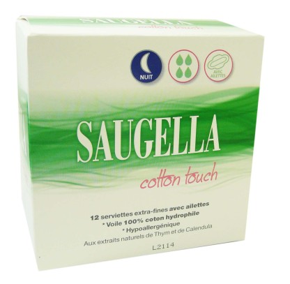 I Les serviettes extra-fines Nuit Cotton Touch de SAUGELLA dans votre parapharmacie en ligne discount, s’utilisent au quotidien pour toutes les femmes même à la peau sensible pour une protection optimale pendant le sommeil.