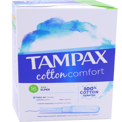 La marque TAMPAX 1ère marque de tampons, propose une large gamme de tampons répondant à tous les besoins hygiéniques en matière de taille, d’intensité de flux, avec ou sans applicateur… Dotés d’un voile protecteur absorbant et fait à base de 100 % de coton non traité, les tampons TAMPAX Cotton Comfort s’insèrent tout en douceur et se mettent en place facilement, tout en retenant le liquide à l’intérieur du tampon pour une sécurité maximale. Il est doté d’une jupette anti-fuite à la base du tampon qui prévient les fuites pour une utilisation optimale. L’applicateur permet une insertion plus facile, et le cordonnet un retrait tout en douceur. Leur format compact rétractable permet une utilisation en toute discrétion.