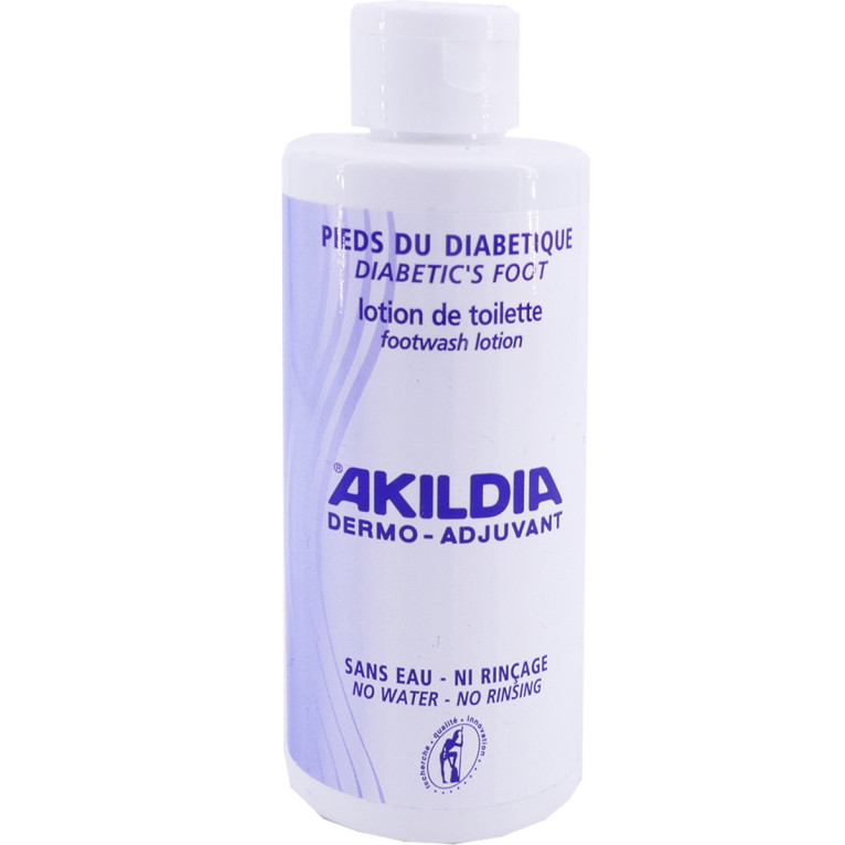 Nettoyer les pieds avec un coton imprégné de lotion Akildia. Insister entre les orteils. Sécher les pieds délicatement sans frotter.Ne pas utiliser sur une plaie.