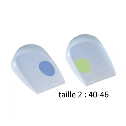 Les Talonnettes Silicone Evolutive composées de silicone vont contribuer au soulagement de la douleur en absorbant les chocs entre le sol et le pied afin que le talon ne soit pas en contact direct avec le sol, et à améliorer le confort dans les chaussures. Les talonnettes ont une zone évidée qui permet d’adapter le confort du pied selon le type de douleur : insert vert anis lors d’épine calcanéenne et insert bleu pour les autres pathologies et le pied sain. Les canaux de ventilation permettent un flux d’aération optimal au niveau du pied pour un port confortable. Le rebord haut des talonnettes permet un bon maintien dans la chaussure.