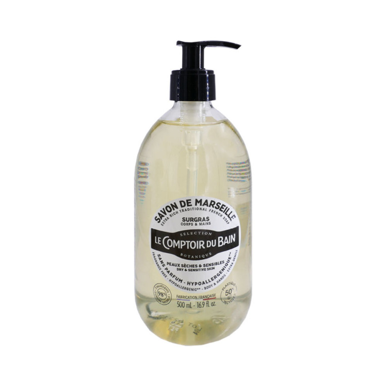 Le Comptoir du Bain, n°1 des savons liquides en pharmacie, développe des produits « made in France », issus du savoir-faire authentique d’un maître savonnier et d’un parfumeur à Grasse, aux couleurs acidulées et aux parfums tendances, raffinés ou gourmands, pour offrir bien-être et plaisir au quotidien. Les savons traditionnels de Marseille liquides du Comptoir du bain ont une base issue de la saponification d’huiles végétales naturelle. Ils sont si doux qu’ils peuvent être utilisés par les peaux les plus sensibles pour laver les mains ou le corps. Sans conservateur. Sans graisse animales Sans sulfate. Découvrez le savon surgras hypoallergénique sans parfum pour les mains sensibles.