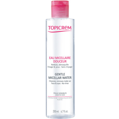 L’Eau nettoyante douceur de TOPICREME, Le soin 2en1 pour nettoyer en douceur et démaquiller le visage et les yeux des peaux sensibles de toute la famille.