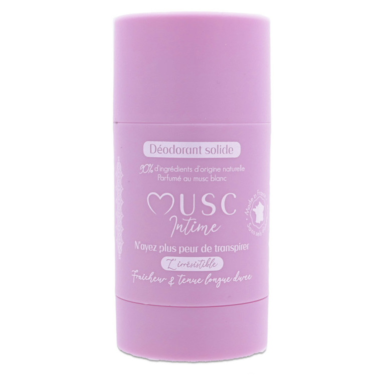 Développé par la marque MUSC INTIME, ce déodorant solide "L'Irrésistible" se distingue par sa composition naturelle soigneusement élaborée.