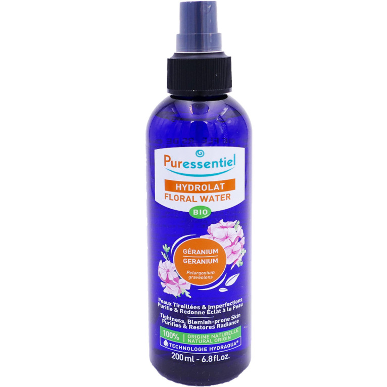 Les HYDROLATS de PURESSENTIEL 100% naturels et bio qui ne contiennent pas de conservateur, prennent soin de toutes les peaux en répondant aux besoins du quotidien (nutrition, hydratation, imperfections, éclat). Obtenus par distillation à la vapeur d’eau des parties de plantes biologiques, ainsi que par la technologie HYDRAQUA, ils permettent de préserver intégralement le végétal et ainsi être efficace naturellement. L’Hydrolat de Géranium Rosat est un soin qui purifie la peau et l’apaise pour lui redonner de l’éclat.