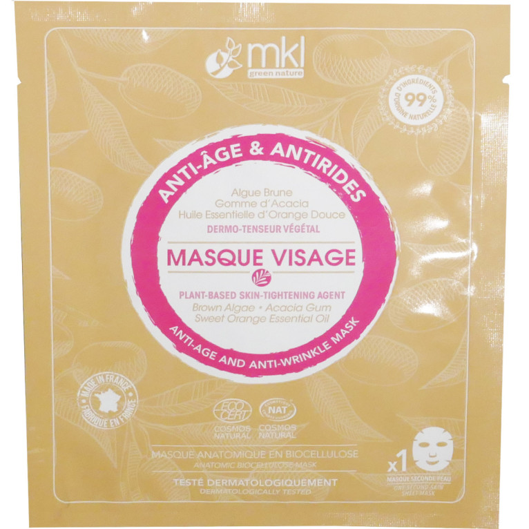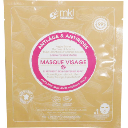 Le Masque Visage Anti-âge & Antirides Bio de MKL Green Nature discount, les bienfaits de la nature dans votre parapharmacie en ligne, dans un masque imbibé spécialement formulé pour atténuer visiblement les signes du vieillissement cutané et offrir un effet raffermissant instantané. Peaux matures du visage