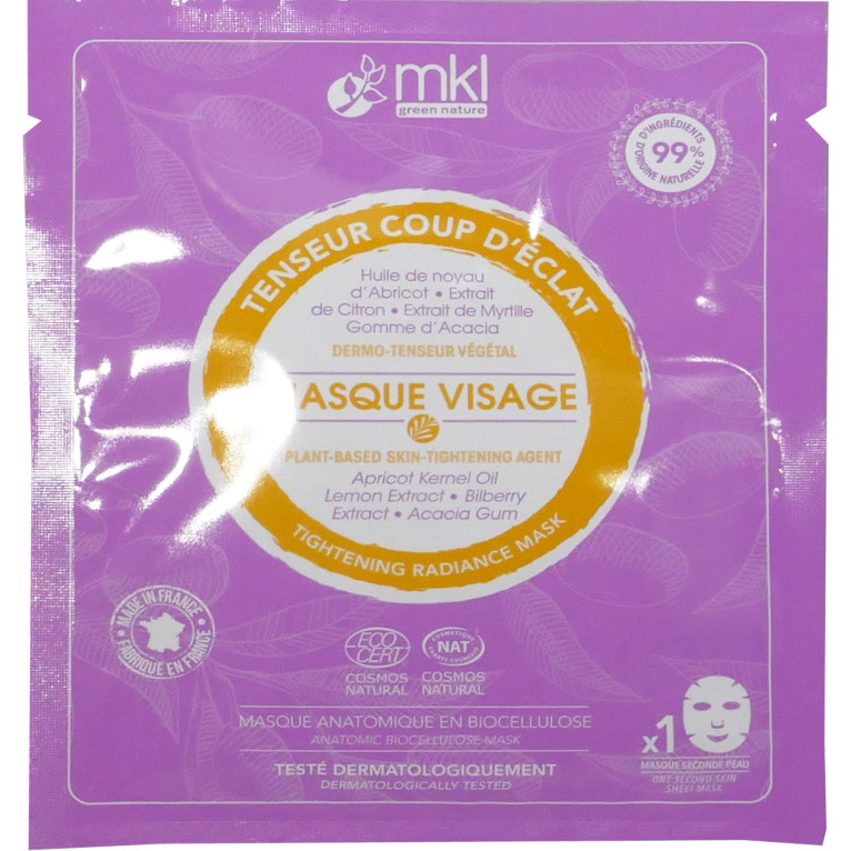 MKL Green nature propose des soins composés d’ingrédients naturels et authentiques, issus de formules ancestrales dont l’efficacité n’a jamais été remise en question, testés sur un panel de volontaires et non sur les animaux, garantis sans paraben, sans chlorhydrate d'aluminium, sans alcool et sans graisse animale. Le Masque Visage Tenseur Coup d’Eclat Bio, au conditionnement individuel, est composé d’actifs tenseurs, antioxydants, hydratants et liftants à base d’huile de noyaux d’abricot, d’extrait de myrtille, de gomme d’acacia et d’extrait de citron. Il va régénérer et lisser la peau afin d’estomper les rides installées, protéger de la déshydratation et du vieillissement cutané, et lui redonner une seconde jeunesse. En bio-cellulose, le masque adhère parfaitement à la forme du visage pour un soin confort. En seulement quelques minutes de pose, la peau est lissée les rides estompées. Le visage est éclatant et retrouve sa jeunesse. Testé dermatologiquement