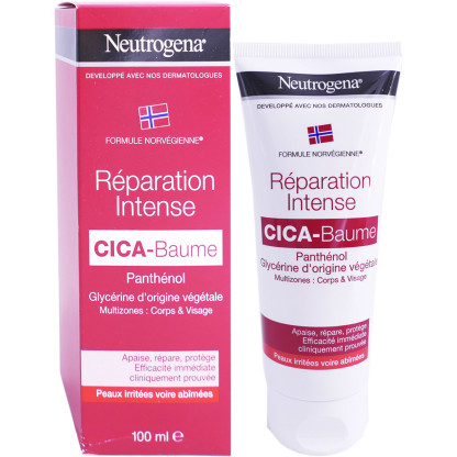 Cica-Baume Réparation Intense discount de NEUTROGENA, le soin à la formule norvégienne développé par des dermatologues dans votre parapharmacie en ligne à prix discount pour réparer et soulager intensément et pendant 6 heures la peau abimée ou irritée de toute la famille (à partir de 3 ans). Visage et Corps