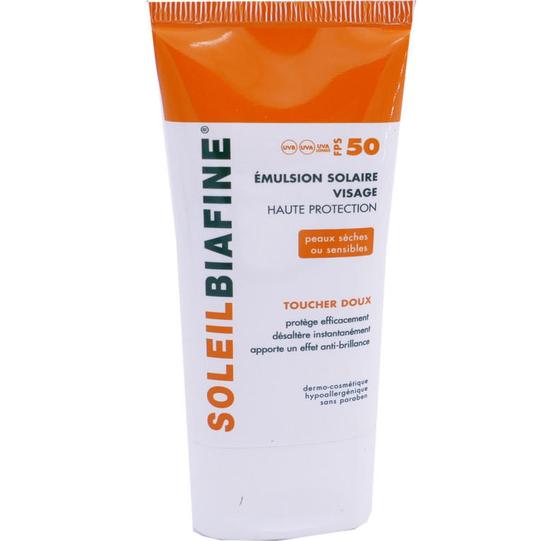 La gamme Soleilbiafine du laboratoire BIAFINE propose des produits hautement efficaces pour protéger la peau de toute la famille du soleil par sa formule essentiellement composée d’un actif végétal antioxydant. L’Emulsion Solaire Visage 50SPF protège très efficacement des coups de soleil les cellules de la peau du vieillissement prématuré en luttant contre les rayons UVA/UVB, et hydrate intensément et en continu, grâce au système exclusif photostable de filtres anti-UVA/UVB à large spectre, au feverfew (actif breveté d’origine végétale), à un dérivé de la vitamine E qui est un puissant anti-oxydant, ainsi qu’à la glycérine humectante et hydratante. Sa texture légère et résistante à l’eau est vite absorbée pour une peau douce et confortable. Hypoallergénique, non comédogène