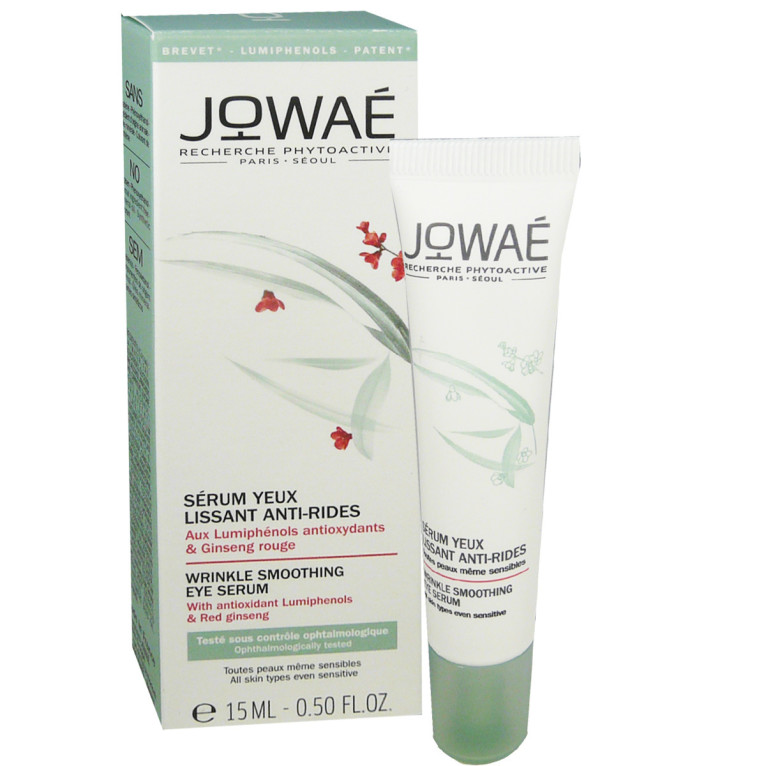 La marque JOWAE inspirée des rituels des femmes coréennes se compose de produits cosmétiques phytoactifs issus de la recherche franco-coréenne à base de lumiphénols et ingrédients naturels pour prendre soin de la peau de toutes les femmes et révéler beauté et confort. La gamme Anti-rides permet grâce aux pouvoirs du Ginseng Rouge de retrouver jeunesse et éclat, et redonner au visage sa luminosité. Le Sérum Yeux lissant anti-rides est un soin à base de Lumiphénols (riche en antioxydant) et de Ginseng Rouge, associé à une algue brune, de la cameline, de l’acide hyaluronique, et de la glycérine végétale. Il va protéger la peau des agressions extérieures (pollution, changement de température,…) en formant un film protecteur et laisser une grande douceur, estomper et lutter contre les rides et ridules du contour des yeux, atténuer les marques de fatigue (poches et cernes) et intensément hydrater la peau. Dès l’application, la peau retrouve douceur, souplesse et confort. Le regard retrouve son éclat et sa jeunesse. Testé sous contrôle opthalmologique. Sans parfum, sans paraben, sans phénoxyéthanol, sans huile minérale, sans ingrédient d'origine animale*, sans silicone**, sans colorant de synthèse
