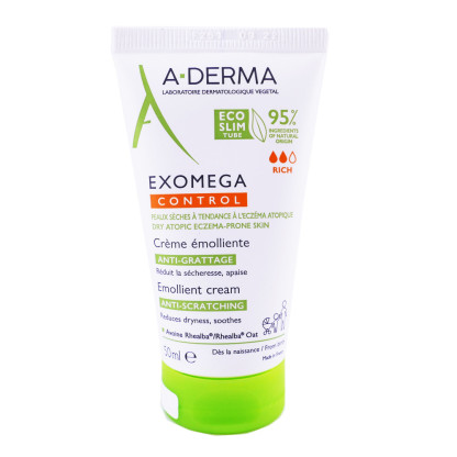 La Crème Emolliente Anti-grattage EXOMEGA CONTROL discount d’A-DERMA, le soin protecteur et apaisant des peaux sèches à tendance à l’eczéma atopique qui démangent avec grattage du visage et du corps de toute la famille (dès la naissance, enfant à adulte), dans votre parapharmacie discount.