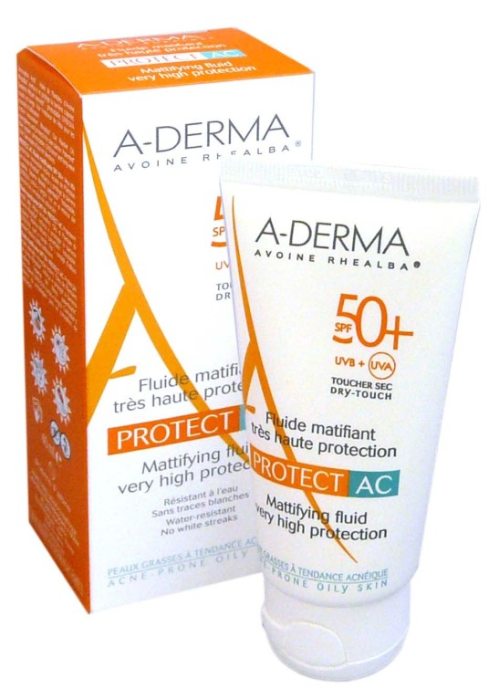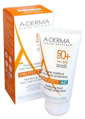 La gamme Protect d’Aderma, est composée de produits solaires qui protègent des coups de soleil le visage et le corps de toute la famille. Le Fluide matifiant Protect AC SPF 50+ est la très haute protection spécifique de la peau grasse à imperfection. Elle protège efficacement des dangers du soleil tout en préservant la peau. Son système filtrant breveté anti-UVA-UVB longs et courts, protège en toute sécurité la peau fragile en renforçant les défenses de l’épiderme. L’huile de plantules d’avoine Rhealba protège le film protecteur de l’épiderme et le renforce. Le fluide limite l’effet de brillance sur la peau en la matifiant. Sa texture fluide qui fond à l’application laisse la peau douce avec un toucher sec, et matifiée pour lutter contre les zones de brillance. Elle ne laisse pas de traces blanches sur la peau, et est très vite absorbée. Résistant à l’eau.