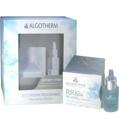 Le coffret ALGOHYDRA d’ALGOTHERM dans votre parapharmacie en ligne à prix discount,, 2 produits pour prendre soin des peaux sèches et sensibles du visage pour une hydratation et un confort tout au long de la journée : Crème Repair Re-Source (50ml), et Sérum nutri-ressource offert (15ml)