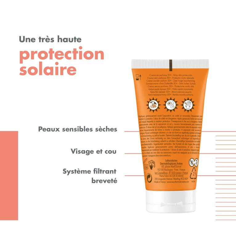 Crème SPF50+ Fini invisible Sans parfum discount d'AVENE, la très haute protection solaire des peaux sensibles et sèche, dans votre parapharmacie en ligne à prix discount. Visage et cou