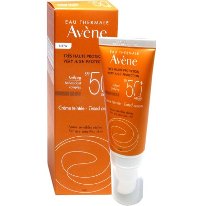 La gamme solaire des produits AVENE, prennent soin des peaux fragiles (sensibles et intolérantes) des petits et grands pour un maximum de protection contre le soleil par un complexe photoprotecteur breveté (SunSitive® protection) et l'eau thermale d'AVENE pour ses propriétés apaisantes. La crème teintée, sans paraben ni silicone, protège très efficacement la peau sensible des rayons UVA/UVB longs et courts (SPF50+), préserve les cellules cutanées du vieillissement prématuré par ses actifs photoprotecteurs pour un minimum de filtres chimiques, ainsi qu'au Pré-tocophéryl qui est le précurseur photostable de la vitamine E antioxydant. En plus de la protection du soleil, le soin illumine le teint naturellement « effet bonne mine » grâce à sa couleur teintée dorée L'eau thermale d'AVENE, quant à elle apaise la peau. Sa texture non grasse pénètre rapidement à l’application pour laisser la peau douce. La peau est douce, le teint retrouve toute sa lumière. Résistante à l'eau et à la transpiration.